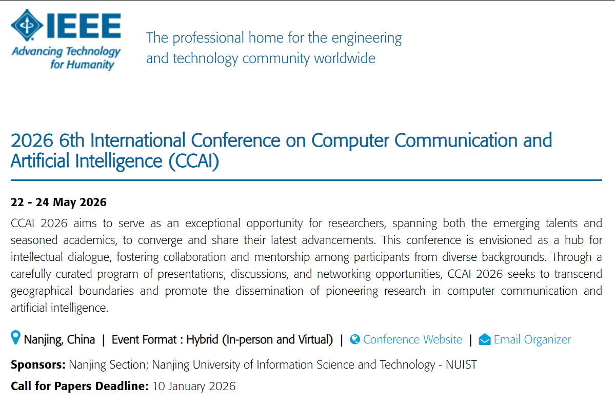 2026 the 6th International Conference on Computer Communication and Artificial Intelligence (CCAI) will be held in